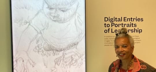 “Portraits of Leadership” is a collection of drawings and paintings by local artists—and many school children—that accompanies the MFA’s temporary display of the National Gallery’s portraits of former President Obama and his wife Michelle. In one large, spacious gallery, hang two life-size portraits of the Obamas. In the corridor beyond, and on plywood walls built around columns in the visitor information area, are the community contributions to the exhibit: 5×7 sheets of paper, portrait orientation, stapled or stick pinned directly to the plywood. In the corner near the atrium café is a single digital display, where more than a hundred digital entries scroll through; ten seconds per image. Jackie and I waited patiently for “William and his World” to emerge so I could snap her photo alongside her artwork.