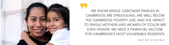 I write my favorite Cambridge City Councilor, Alanna Mallon, who offers a gracious reply. She cites the recent Cambridge Community Foundation report that 70% of Cambridge families in the bottom quintile are single-caretaker households. She cites targeted pilot programs from other areas of the country. She does not, however, address why the program denies application to the other 30% of bottom quintile families simply because they are headed by multi-caretakers.