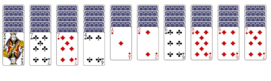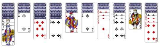 The Internet offers many spider solitaire programs. I use solitir.com, which has a clean interface. Open the program and this is what you’ll get: ten columns of cards, forty-four face-down, ten face-up. The remaining fifty cards sit in an upper-left, face-down pile.