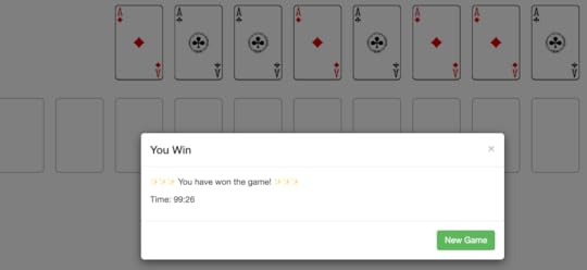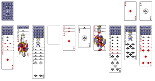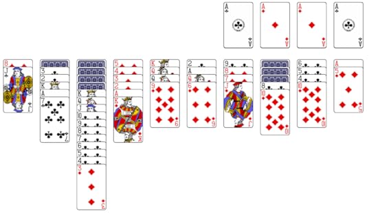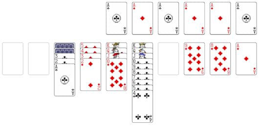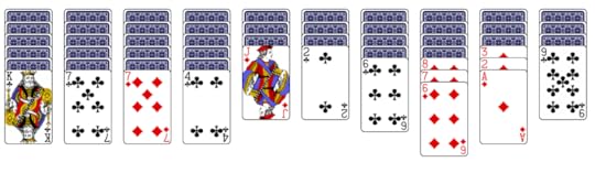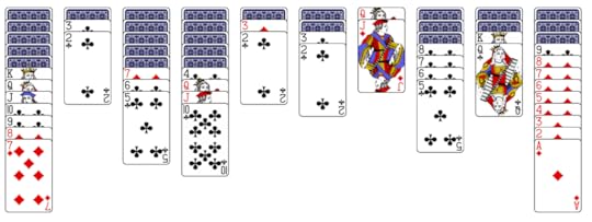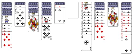 At this point you may wonder, where are the hearts and spades? Spider solitaire can be played at three levels: easy (all cards are clubs); moderate (four sequences each of clubs and diamonds); difficult (two sequences each of clubs, diamonds, hearts, and spades). Once you’re familiar with the game, you’ll almost always win a round of all clubs, it’s that easy. On the other hand, playing all four suits is ridiculously hard. I play the moderate level, and, with improved strategy, win about 25% of the time. Often enough to find it challenging without being discouraging.