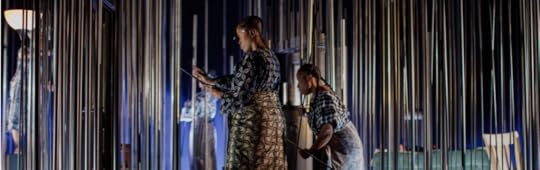 Adiaha, first born, is home from New York where she recently received a Master’s in Creative Writing. Time for a party! Which means men pontificating politics while women cook and serve and the children try to escape. The play gains traction when the set rotates and, beyond the thicket of poles, we enter Adiaha’s childhood bedroom and the reasons for her discontent become clear. Adiaha has a female lover in New York; she cannot reconcile her family with her desires. She starts writing wild, illegible stuff, prompted by shadows that emerge within and among the poles: Nigerian women from a world Adiaha has never experienced. It’s confusing, but also engaging. The audience hangs on to every utterance it cannot understand.