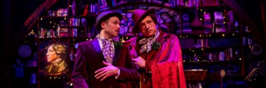 Speakeasy’s set is a pub, with a traditionally Irish back wall of books and booze. Or maybe it’s a church, with its prominent stained glass of Christ. Or perhaps it’s an homage to Oscar Wilde, who’s own stained glass sits just lower left of the Lord. The band sits in front of the bar. A few full-time players, with the actors filling in on all sorts of instruments. The stage proper is busy place, what with a cast of fifteen playing various Dubliners and infiltrating the band. The movement flows smooth and continuous as a good pint among mates.