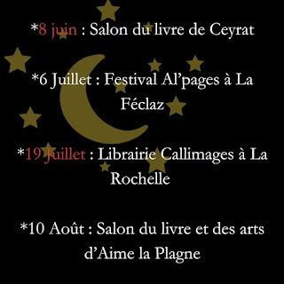 Tu n'as pas pu venir aux Imaginales ? Pas de problème, voici encore quelques dates de dédicaces pour cette fin de Printemps et cet Été, avec deux nouvelles dates par rapport au planning annoncé en début d'année :