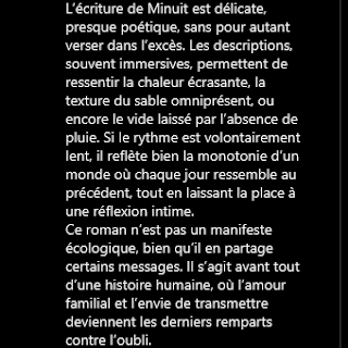 L’écriture de Minuit est délicate, presque poétique, sans pour autant verser dans l’excès. Les descriptions, souvent immersives, permettent de ressentir la chaleur écrasante, la texture du sable omniprésent, ou encore le vide laissé par l’absence de pluie. Si le rythme est volontairement lent, il reflète bien la monotonie d’un monde où chaque jour ressemble au précédent, tout en laissant la place à une réflexion intime.
