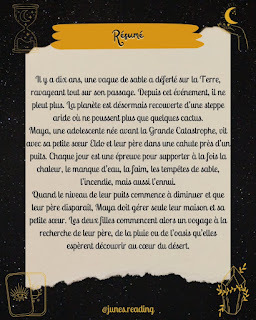 "Dans cette histoire, on débarque dans un monde post apocalyptique. Une vague de sable s’est emparé du monde, l’a rendu aride. On y découvre Maya et sa petite soeur Eldo. On découvre la vie qu’elles mènent avec leur père, sans une cabane qu’ils ont construit avec des matériaux trouvés dans ce nouveau désert.