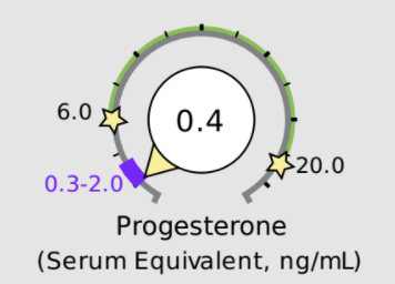 Here’s a screenshot from one of my tests. The green is the healthy range of progesterone (6.0 ng/mL to 20.0 ng/mL) and I’m at the purple, at 0.4 ng/mL.