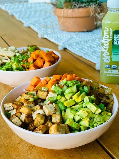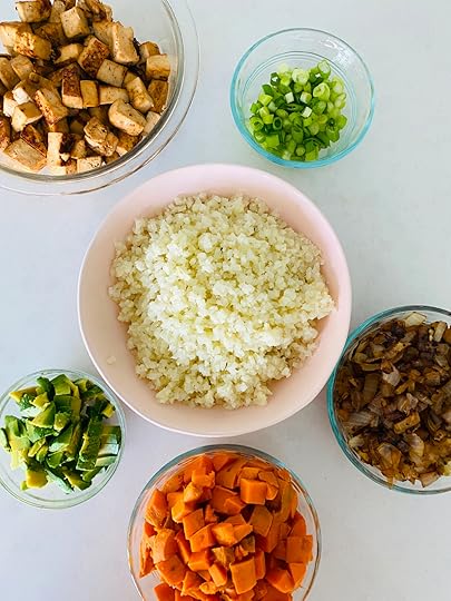 Step 10: Once everything is done, time to decorate your bowl! I put the cauliflower rice on the bottom, and section out the tofu, sweet potato, onions, and avocado on top! Then I sprinkle with some chopped onion. If you’ve got extra marinade, feel free to pour some on your bowl at this point to add even more flavor!