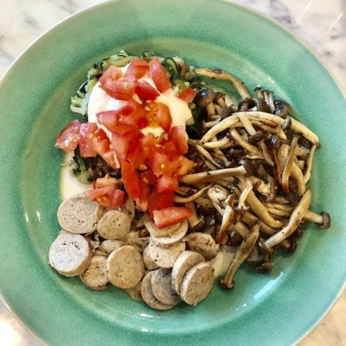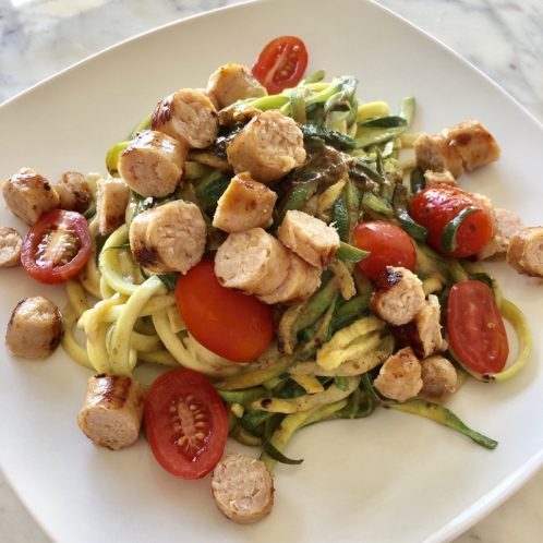 It’s sauteed alfredo zoodles with chicken sausage and cherry tomatoes. ‘Twas perfection. Even Sam liked it.