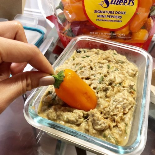 We knew it was going to be a late night at the office, so Sam and I Postmated our dinner. I ate a slice of brisket with collared greens. On the side I had my mini bell peppers with homemade baba ganoush.