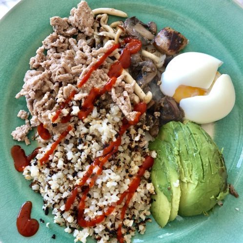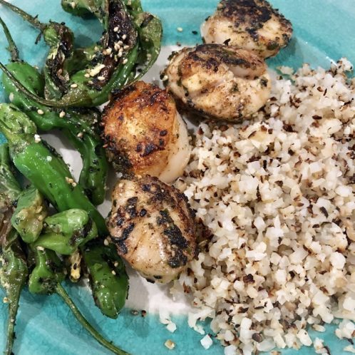 For dinner I made shishito peppers with scallops and cauliflower rice. I also had this with coconut aminos and sriracha. Absolutely delish!