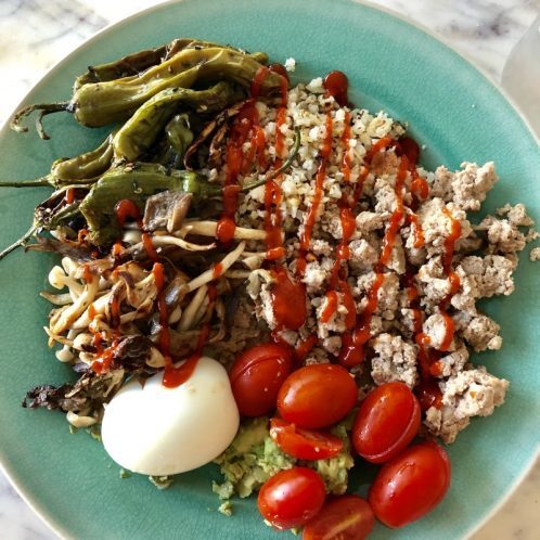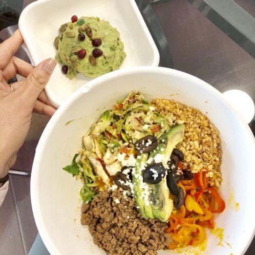 Lunch was this keto bowl from Tocaya Organica. It had cauliflower rice, ground beef, brussel sprouts, bell peppers, avocado, olives, cheese, and hot sauce. I took out the olives. Not a fan. I also ordered guac on the side to share with Sam. So good. This one had pumpkin seeds and pomegranate seeds on top! Super filling. Would def order again.