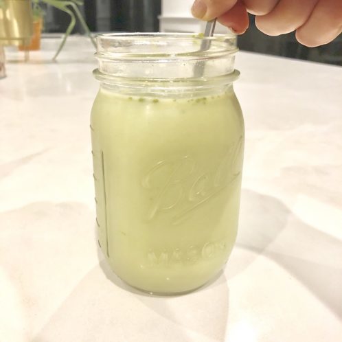 After dinner, I mixed some collagen matcha in with my almond milk. Sorry for the weird green everywhere. I should have mixed the collagen in BEFORE I added all the ice. Either way, it was delish and I kinda enjoy the matcha chunks.