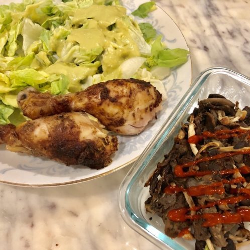 Dinner was rotisserie chicken with butter lettuce smothered in Jalapeño creamy sauce. I had this with a side of mushrooms and sriracha. Man, I love mushrooms so much. They taste like they could pass for meat or tofu. So transformative. Mushrooms are awesome.