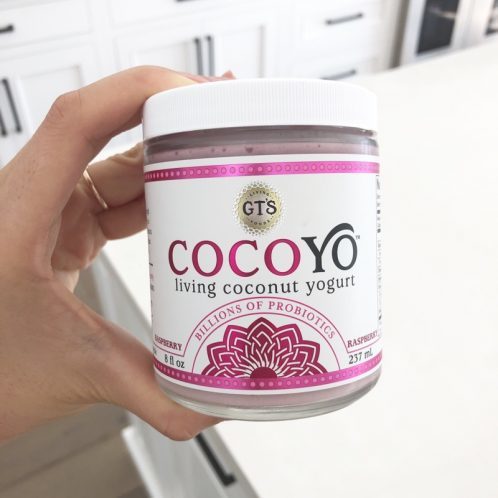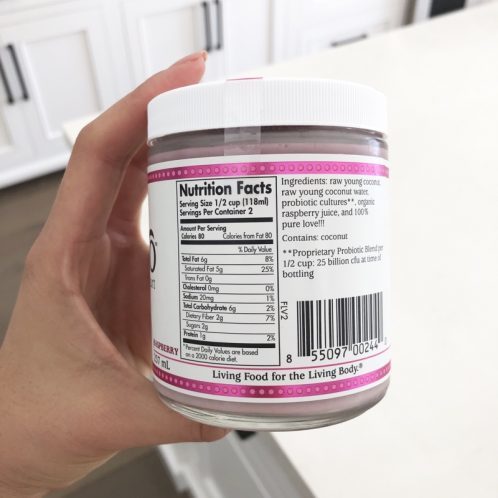 As an afternoon snack, I tried this “Cocoyo” kombucha yogurt that I bought from Whole Foods for…$5.99. I know, I know. SO EXPENSIVE! But cute glass jar packaging got me and so did the nutrition label on the back!