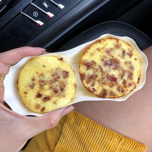 After I showered, I microwaved some egg cups (from Costco) and ate them in the car! Sam and I shared. By the way, I have mastered the art of feeding Sam while he drives. Anyone else do this too!?