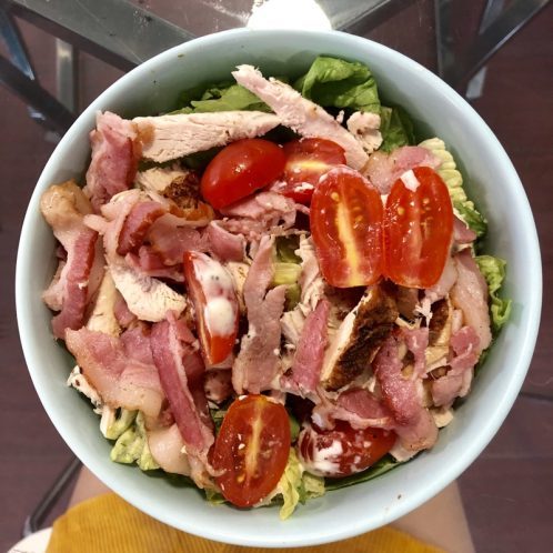 For lunch, I made Caesar salad! OMG, it was DELISH. I can’t believe I haven’t eaten Caesar salad for so long! I put rotisserie chicken, cherry tomatoes, cheese, and bacon over the romaine lettuce. I also made Sam a Caesar salad too and he LOVED it! So filling and so good.