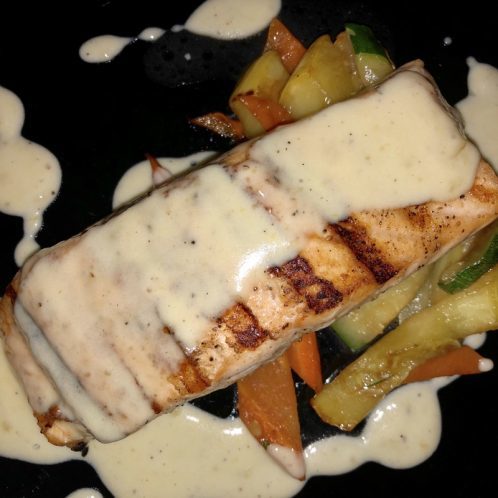 And for my main meal, I got salmon over veggies with a butter sauce. UMM. This was SOOOOOO good. I need to figure out how to make this sauce!!!