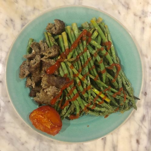 For dinner, I had the leftover koobideh with a ton of asparagus. I squeezed Sriracha all over it and it was SO YUM.