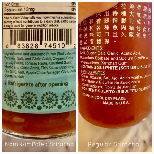 First off, you can see that the Nom Nom Paleo Sriracha is sweetened with organic date syrup whereas the regular one uses sugar. Plus it lists tomato, garlic and apple cider vinegar as ingredients – things I actually understand!