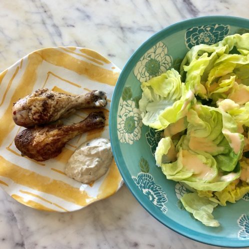 This was lunch after my lifting workout. Chicken drumsticks. Baba ganoush. Butter lettuce with some sriracha dressing that I bought and don’t like. Lunch was ok.