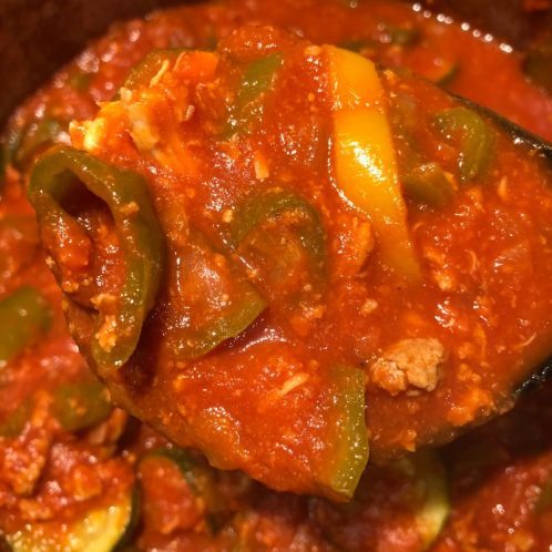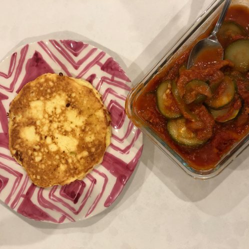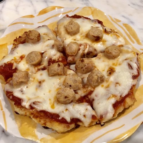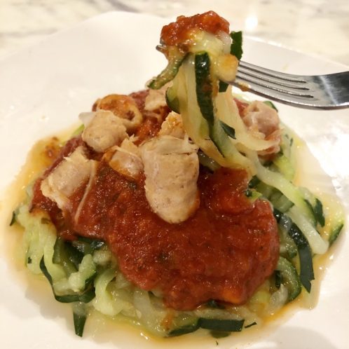 Overall, it was good, but kinda mushy. You can also see that water kept seeping out after I microwaved it, even though I drained it and paper toweled it. Next time, I think I’ll defrost and then put it on the pan. Topped my zoodles with marinara sauce and chicken sausage. YUM!