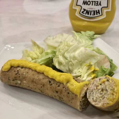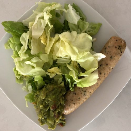 I got really hungry before dinner so I made myself a paleo sausage, smothered it with mustard, and ate butter lettuce on the side. I know it looks weird but it was actually really good!