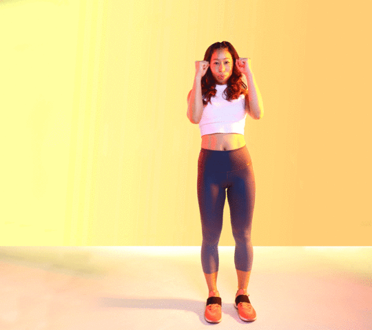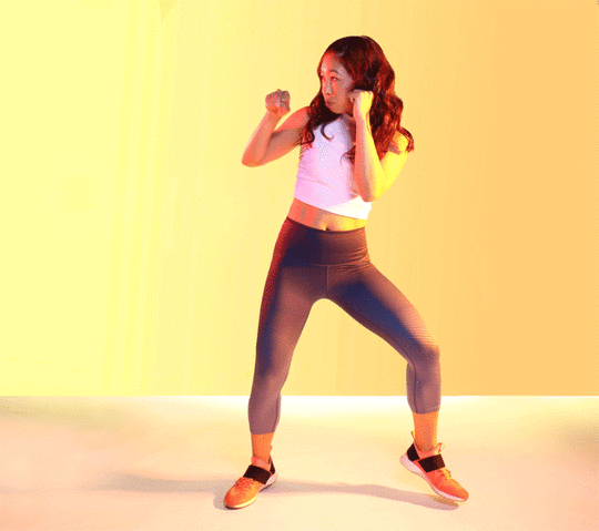 In a wide plié stance, squat down, and lean your obliques from side to side. Keep your hands at ready stance, right by your chin.