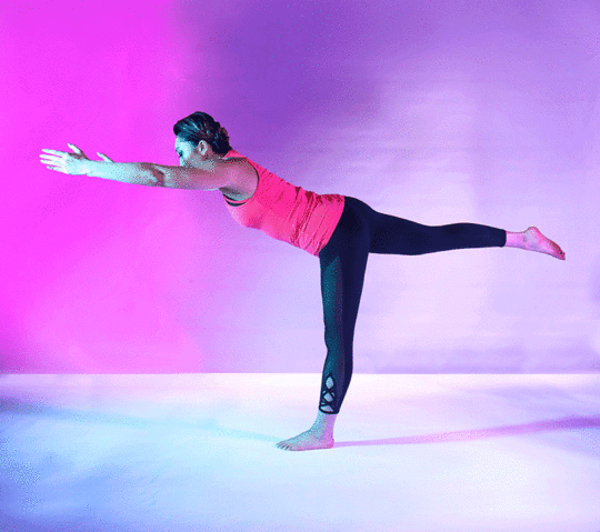 Then slowly balance yourself on your left leg, extend out into warrior 3 and curl it in…