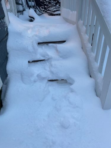It snowed a lot. We got about 18 inches I’d guess but due to winds and blowing there were some drifts way deeper than that. Matt and Whit were in Vermont skiing so I did a lot of shoveling. The photo above is our back stairs. I’d shoveled them less than 2 hours before this photo. It came down fast. I like a storm though I’m ready to be able to walk Phoebe in sneakers again so it can melt now anytime.