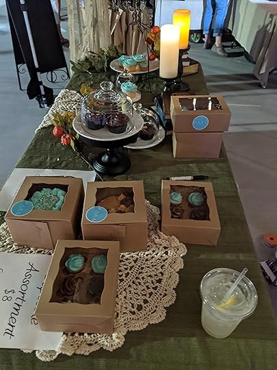 My booth in action. My mom and sisters brought decorating supplies and an enormous pumpkin and helped me set up this table. We kept some stock inside the building but stacked a lot on my table.