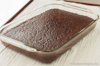 This is my recipe that I like to use for chocolate cake when I going to make something like my Chocolate Stutter Cake or Buckeye Cake. It's not as fluffy, a little gooey, and bakes and cools quickly. It can hold it's shape once cooled without crumbling. It also freezes and reheats well in single servings. It's halfway between a cake and a brownie.