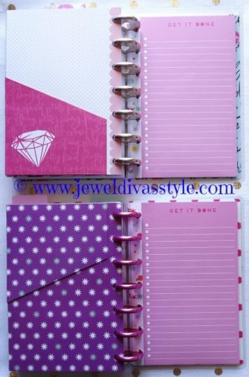 Using the pink medium rings that came from the planners I pulled apart, I was able to make these two sets of half sheets. Trendsetter on the left, Glam Girl on the right. I placed the matching sticky notes at the back of the book. Each book contains two sets of sheets, each set is 60 pages. That’s 120 pages, plus sticky notes on medium rings with a dashboard cover and …