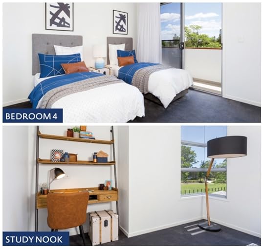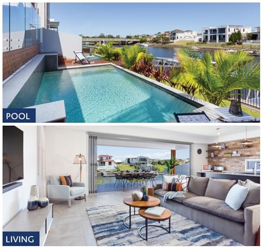 A house in Helensvale on the Gold Coast, fully furnished, air con and heating, pool and patio, four bedrooms with muted tones and wood. There is currently a house being built next door, and I have no idea why houses are built so close together these days, but if you like it, you also get ONE MILLION IN GOLD!
