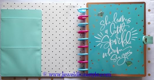 I put the pink and blue discs on it and put the leftover Trendsetter and Glam Girl planners into it, along with the pockets dividers, and slid it into the green deluxe cover…