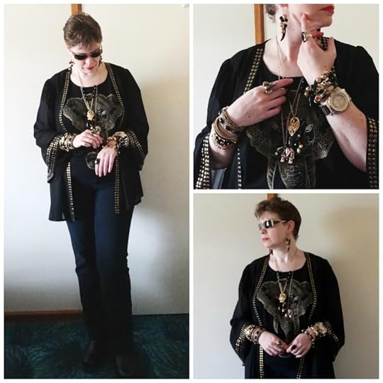 JEWELLERY: Jewel Divas blue skull set and bracelet stacks. eBay bangle on right arm, and Lovisa long necklace.
