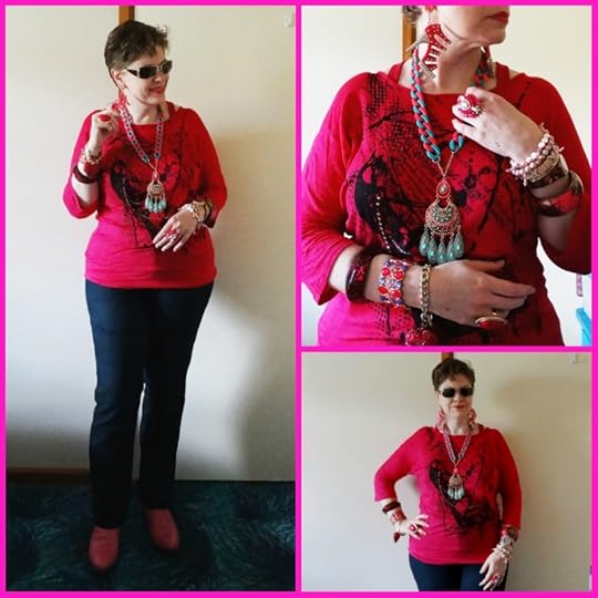 JEWELLERY: Mask earrings I bought for $8 from a market back in the early 90s. Chain store bracelets.