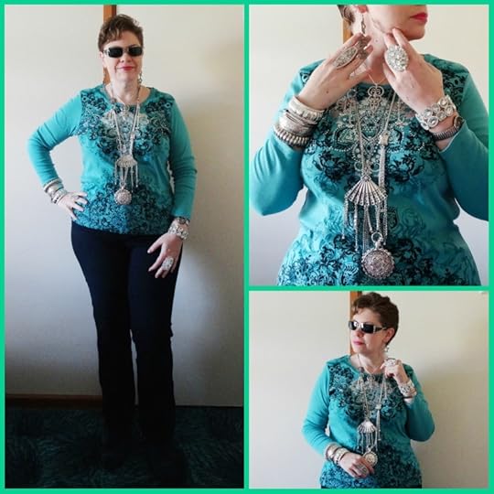 JEWELLERY: mixture of Lovisa (necklace, earrings, left hand bracelet, right hand mint bangle and both rings) and eBay (dragon and stone bangles)