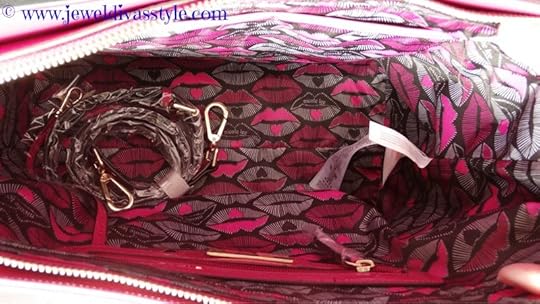 They aren’t leather, but labelled vegan leather, basically pvc plastic. The interior is a good strong material with a kiss print. There’s a long strap and two good handles, four studded feet on the bottom so the patent pleather doesn’t get scratched, and the zip works really well. If it’s one thing I hate with a bag, it’s a zip that sticks and busts.