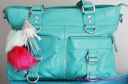 So far this year I’ve bought four handbags, three in the colour of blue…of course. All under $55, but not leather. That went to the 3Annies one I bought last year. And it seems that bags, especially from the chain store Colette by Colette Hayman, are all coming with bag bling. So I went and bought some and got in on the pom pom craze that’s going round.