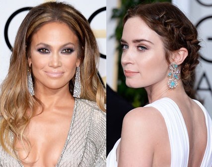 Personally, I think a BIG blingy piece is warranted, especially a necklace and especially if you have a low cut and plunging neckline that does nothing but show bare skin. At the Golden Globes this year there were necklaces on show, rather plain boring ones in my view, and a few earrings. The best, being Emily Blunt’s, striking out from the plain Jane’s by being blue.