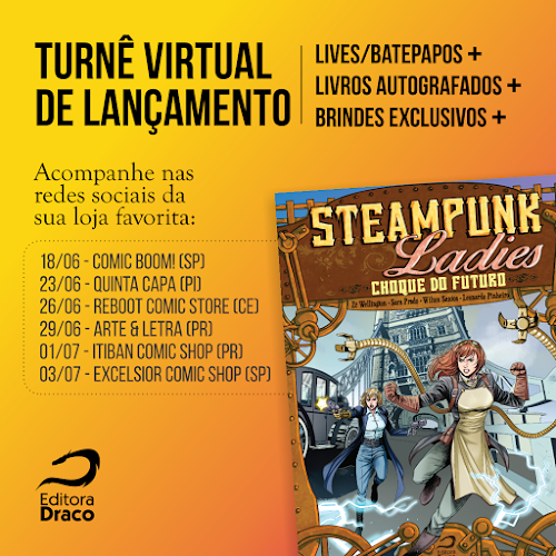 Assim, começando amanhã até o dia 3 de julho, acontecerá a Turnê Virtual de Lançamento de Steampunk Ladies: Choque do Futuro. Uma nova forma de distribuição, que monetiza também as lojas, foi pensada pra esses eventos. Respeitando as recomendações das organizações de saúde, os eventos digitais acontecerão em forma de transmissões ao vivo no Instagram das lojas, com minha participação e de outros colaboradores da HQ. Os quadrinhos nem vão chegar a ir para as comic shops, pra agilizar e baratear o processo eles vão sair daqui de casa, com autógrafo, dedicatória e brindes exclusivos (tudo que o leitor teria direito num evento presencial), direto para a casa dos compradores. A compra vai ser feita pelas lojas virtuais das comic shops e livrarias envolvidas. Inicialmente, a turnê “passará” pelas cidades de Fortaleza, Teresina, São Paulo e Curitiba.