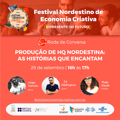 Amanhã estarei no Festival Nordestino de Economia Criativa. Meu irmão baiano Hugo Canuto e minha comparsa na dominação mundial dos quadrinhos nordestinos Thaïs Kisuki vão estar comigo num papo sobre fazer quadrinhos no nordeste, no dia 29 de setembro (terça-feira), a partir das 16h. O evento vai rolar dentro da programação do Festival Nordestino de Economia Criativa, uma realização dos Sebrae, que começa hoje. É tudo GRATUITO, basta se inscrever no site e o link pro evento vai chegar no seu e-mail: www.festivaleconomiacriativa.com.br