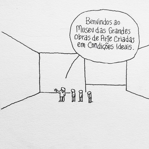 Aí entra um adendo importante: nenhuma história minha é feita nas condições que eu gostaria (como a maioria das pessoas pensa que acontece). Leia-se por condições ideais sentar-se numa mesa durante uma semana, oito horas por dia, para pensar no que vou contar e, realmente, começar a fazer. Com a) trabalho (muito trabalho) e b) crianças (muito mais trabalho), é comum eu me dedicar intensamente a uma história durante alguns dias e deixá-la guardada por meses até ter tempo para voltar nela novamente. E eu esbarrei com a charge do Odyr que inicia este texto nesses dias e descobri que isso não acontece só comigo.