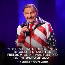 Now, though, it's Kenneth Copeland we find front and center as the face of right wing Christianity, wrapped in the stars and stripes and wearing a MAGA hat. Like the rest of the Prosperity Gospel movement, he's been all in with Trump from day one...birds of a feather, and whatnot...but that's got nothing to do with Christian Nationalism, or a country governed by Christian virtues.
