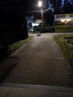 Once I've got the coffee on, that is. After he's eaten, together we step out under a sky dark and speckled with stars, and into a neighborhood still unroused from sleep. The birds aren't yet singing. No cars whisk off to work or school. All is quieter. Not just the neighborhood, but the city itself, the omnipresent hum of gigatons of wheels on asphalt barely a tiptoe. Foxes scamper about, occasionally stopping to glare at the silly human and his dog, so rudely intruding on their pre-dawn hunt.