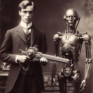 At Stewart’s side strode his ever-trusty series 8, the indefatigable Thomas, who carried a weapon of similar design and evidently equal capacity. Shouldering his weapon, Stewart rushed to my aid, and as he did so, Thomas discharged his own device once and then again for our protection, each time casting out a blinding golden beam that neatly expunged a hapless fascist from this world.