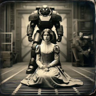 The room was very large, excessively warm, and horrifically bright, as from overhead the blaze of dozens of primitive incandescents stabbed through my bleary eyes and stirred another rushing surge of barely repressed nausea. The hangar…for it most resembled such a structure…had within it a broad assortment of scientific tools and implements, and was filled with the bustle of dozens of men wearing coats such as one might see in one of Stewart’s laboratories. These were hardly the only presence in the space, for standing at even intervals along the walls were a baker’s dozen of the rough armoured forms that had so effectively impeded our flight from the settlement.