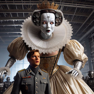 Her Majesty was, in this latest iteration, even more glorious than She had been in Her twenty-sixth generation, now honourably retired. The fundaments of Her appearance remained as you, I and our forebears in the Peerage have known them: Her visage, wrought from an impervious ceramic, was as bone china white as the finest Queen's Wedgewood, and in cast a perfect intermingling of the noble features of Her Twin Royal namesakes, Victoria and Elizabeth the First, whose personalities and wisdom have found a new and eternal life guiding the Peerage. Her Majesty’s hands were constructed of the same material, and though they were many times the size of mere human hands, they retained a distinctly feminine grace.