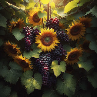 From an old dogwood stump, wild grapevines started growing. Their tendrils snake through the stalks, and in the way of most vines, can threaten to overwhelm the sunflowers. Left unchecked, the tangle of sprawling, smothering wild grape would easily overwhelm the whole stand of sunflowers. It'd become a mass of fruitless grape, the leaves intercepting the light, the tendrils strangling the sunflower leaves. The sunflowers would struggle.