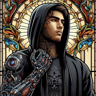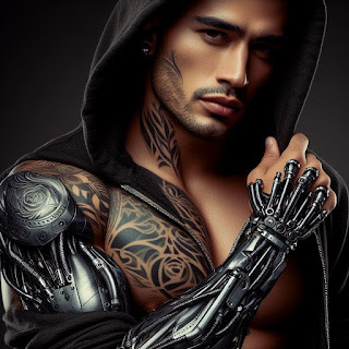 His form was nigh-impossibly well turned, broad but not overbroad of chest and shoulder, possessed of a precise muscularity; his arms, striking in their distinction, one arm decorated with ornate tribal tattoos in a much pleasing pattern, the other a sophisticated and powerful mechanical prosthesis of dark alloy that only augmented his nearly overwhelming virility.